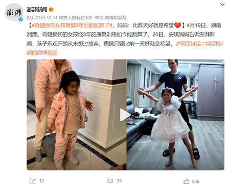 最近,湖南一位曾因学舞蹈练习“下腰”导致瘫痪的8岁女孩安琪,在锻炼3年后能重新行走了,感动了无数网友。